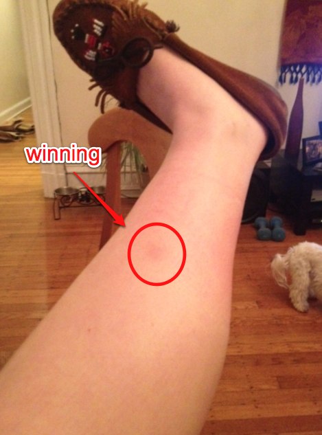 When I was feeling down this weekend about not being able to run I took my frustration out...on my injured leg. Then on Monday I noticed that a different part of my shin bone was hurting and I realized that I had a lovely bruise right where my fist went to town. Good job Kristin! Clearly I know how to win at life.